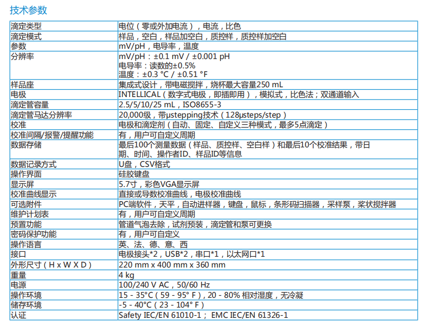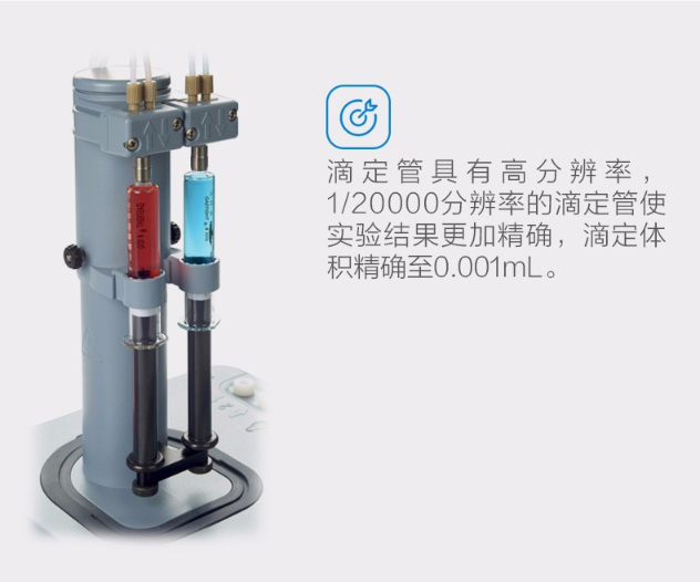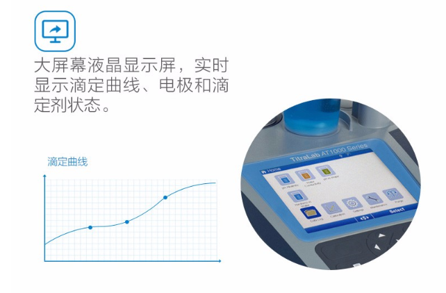 TitraLab® 系列自動電位滴定儀具有大屏幕液晶顯示屏,可以實時顯示滴定曲線、電極和滴定劑狀態(tài);另外滴定管具有高分辨率,1/20000分辨率的滴定管使實驗結果更加精確,滴定體積可精確至0.001mL。